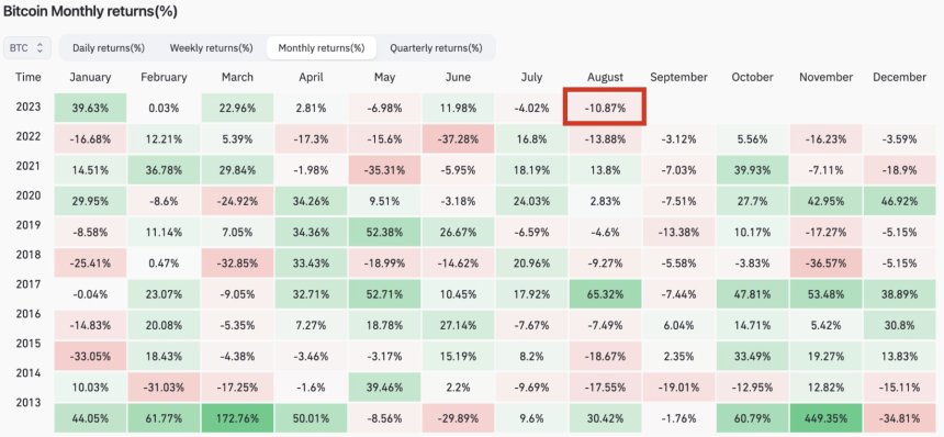 BTC’s recent downside price action pushed the RSI to a historical oversold level, 28. The chart below shows that almost every August with a negative RSI and a BTC monthly return north of 10% leads to a sideways September but to a green October.